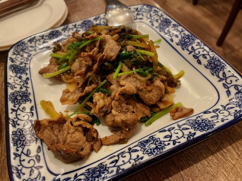 ラムショルダーパクチー発酵菜 炒めは、香ばしく炒められたラム肉に発酵野菜の酸味とスパイスの刺激が加わった一品。